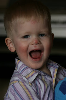 Cute, admittedly, but more than just a little like Rudolph. Rophone and the kids decided to walk home from church in the nice weather and I, by default, was elected to drive the car home. I saw what had occurred as I drove past them, so hurried and got my camera to capture the result of the head-lead fall. (After what happened to Big today, Rophone just may join with me in my no-hard-surface-hill-running beliefs.)